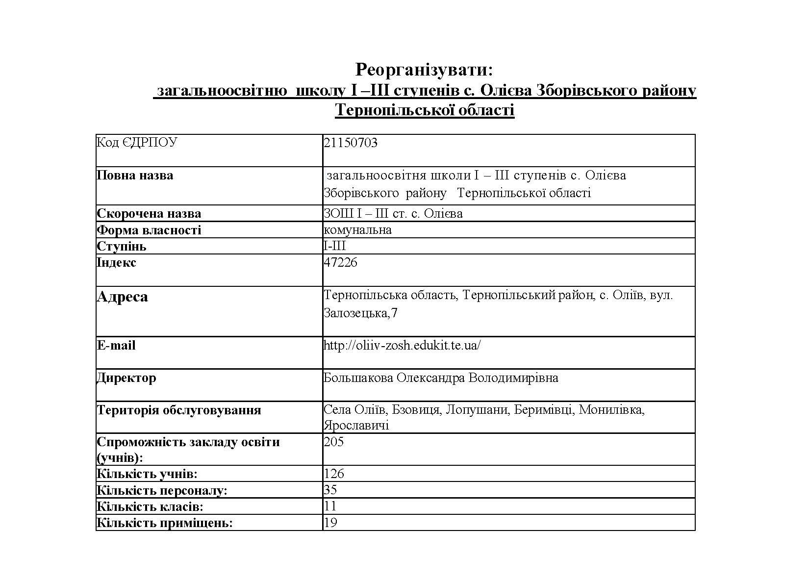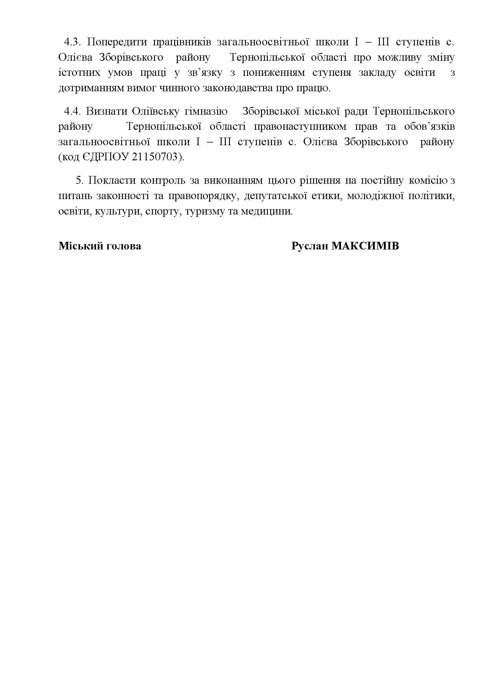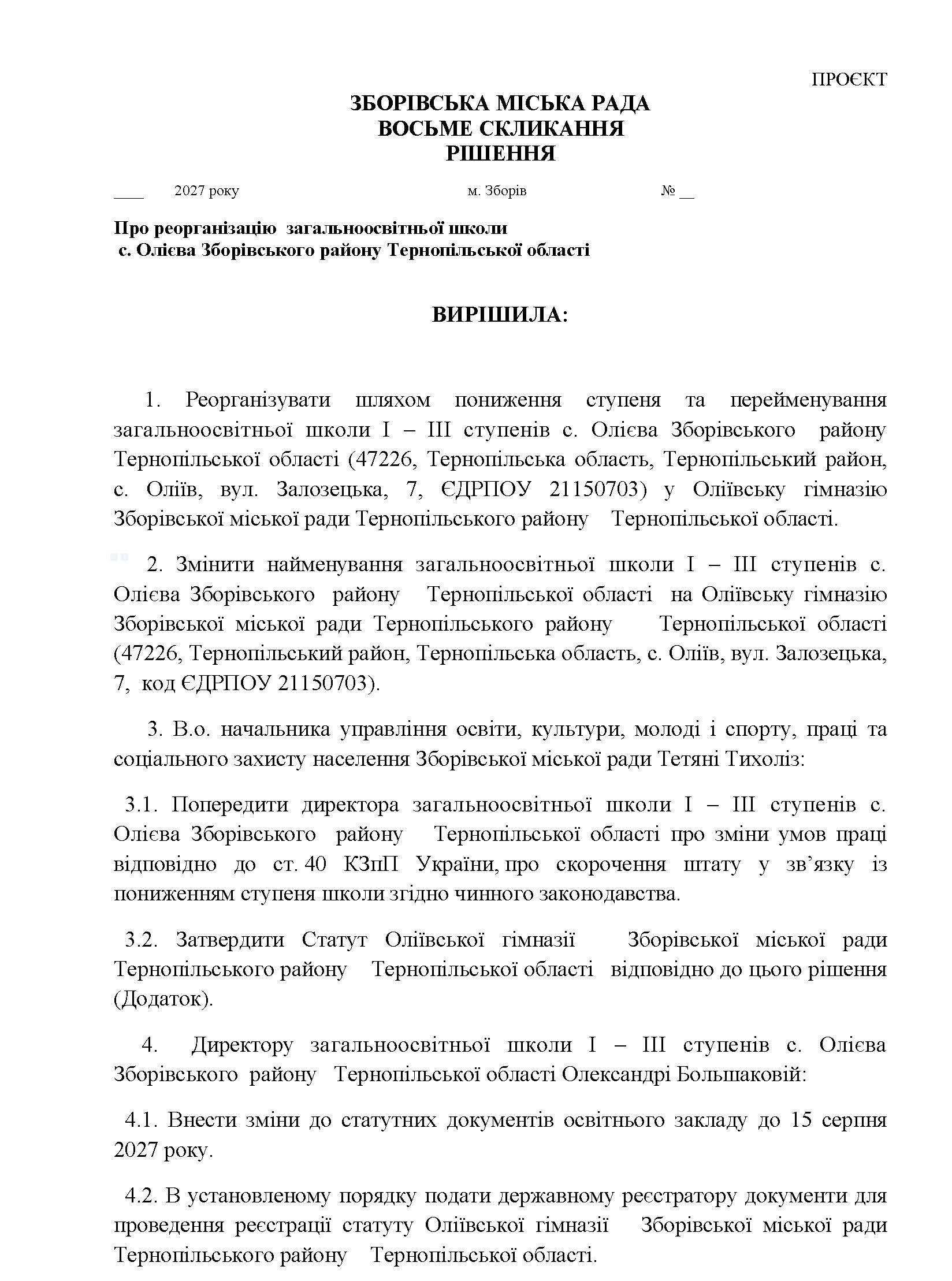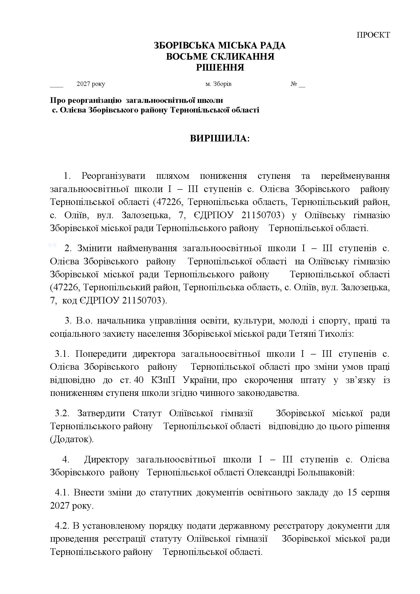 Проєкт рішення Зборівської міської ради про реорганізацію закладу освіти громади: загальноосвітньої школи І – ІІІ ступенів с. Олієва Зборівського району Тернопільської області.